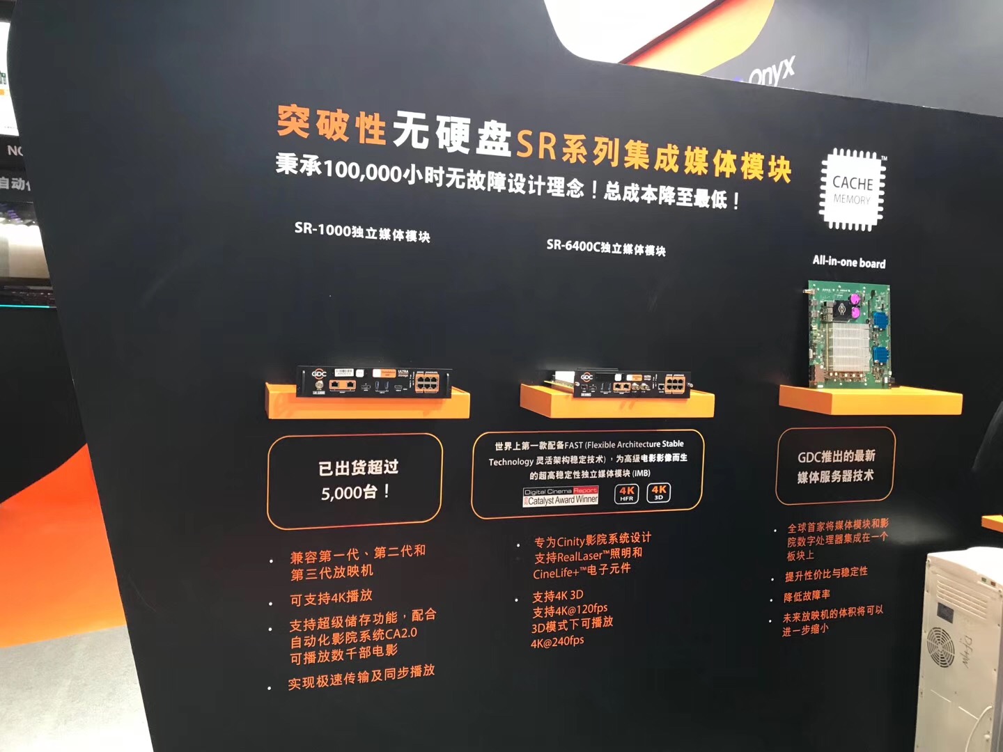 為了支持未來影院對HDR、4K等新技術(shù)的應(yīng)用需求,GDC在此基礎(chǔ)上推出了SR-5400和SR-6400C這兩種服務(wù)器。SR-5400兼容Barco、Christie和NEC的最新一代放映機,支持4K 3D HFR 格式等更高格式電影內(nèi)容放映。而SR-6400C更能支持3D模式下的4K、240fps的電影內(nèi)容。同時,這兩款產(chǎn)品秉承100,000小時無故障的設(shè)計理念,內(nèi)置CineCache(內(nèi)置存儲),無需外接硬盤即可播放電影,與CA2.0集成可播放超過2000部影片;產(chǎn)品高度可靠,并且可以通過手機、平板電腦等遠(yuǎn)程操作。