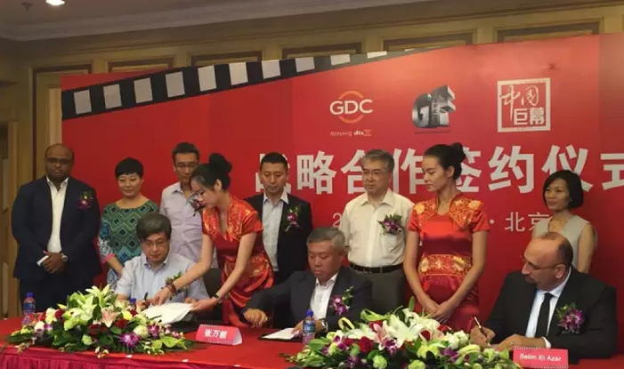 2015年8月16日,中影數字巨幕(北京)有限公司與環(huán)球數碼創(chuàng)意科技有限公司(GDC)及阿聯酋海灣影業(yè)公司在京簽訂了戰(zhàn)略合作意向書。三方計劃未來一年內在海灣國家,包括阿聯酋、巴林、阿曼、科威特等國家合作部署至少5套中國巨幕放映系統,為當地的電影觀眾帶去卓越的巨幕效果和非凡的音響體驗,并且未來還將進一步在這一區(qū)域擴大中國巨幕技術系統的市場推廣力度。這是中國與海灣地區(qū)第一次簽訂如此大規(guī)模的電影相關技術合作協議,對兩地的電影市場發(fā)展和技術進步有重大意義。