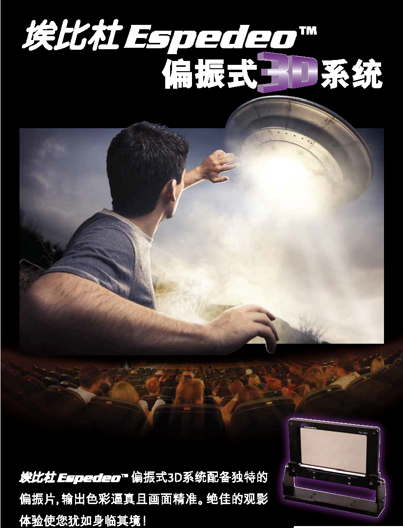 國(guó)際知名品牌—埃比杜Espedeo單機(jī)被動(dòng)偏振式3D系統(tǒng)是為現(xiàn)代數(shù)字影院而精心設(shè)計(jì)的專業(yè)的被動(dòng)3D解決方案,具有完美呈現(xiàn)清晰、震撼及亮麗3D影像的特征。